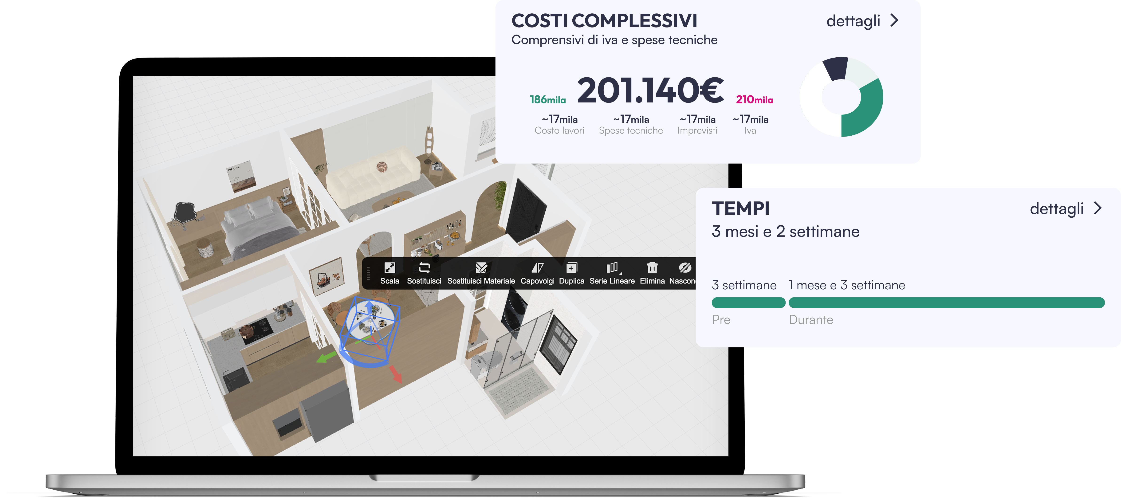 Genera in automatico report con tutti i dati di ristrutturazione (costi, tempi e bonus fiscali) ed efficientamento energetico, potenziando l'acquisizione e la compravendita per i tuoi clienti.