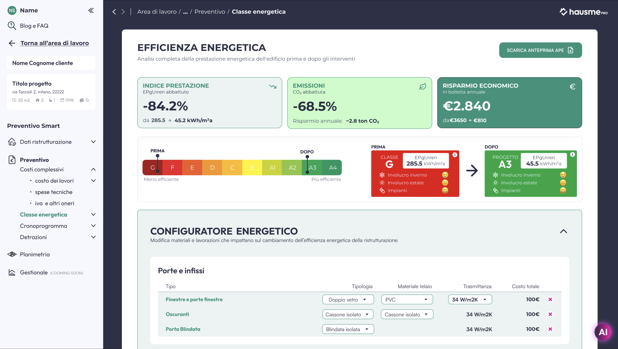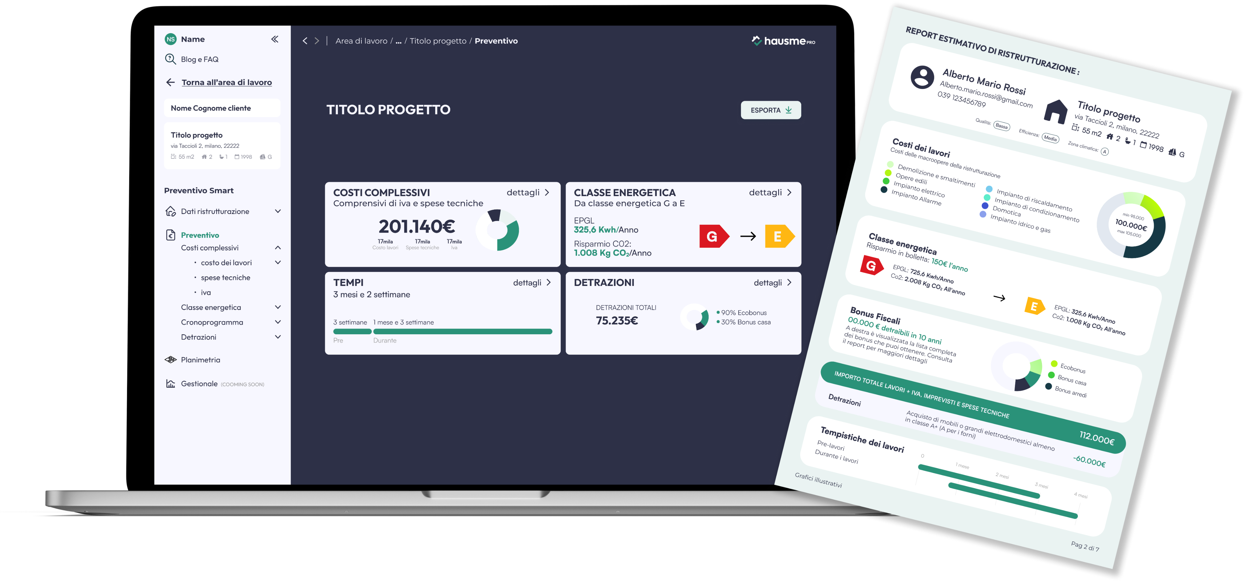 Differenziati dagli altri e offri un servizio impossibile da fare “a mano”. Dai al cliente una proiezione energetica realistica al 99% che mostra l’impatto reale della ristrutturazione su consumi, classe, comfort e costi di gestione dell’immobile.